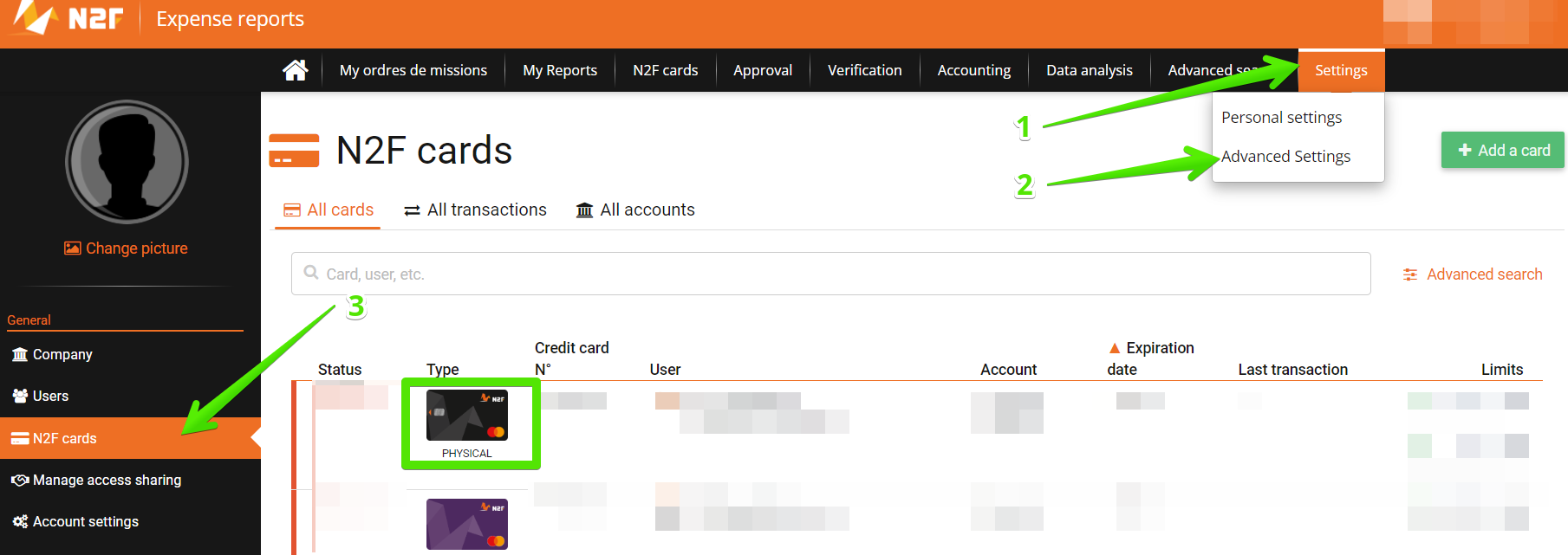 From your web account, in the Settings / Advanced settings / N2F cards section, access your cards and select the card you wish to block: