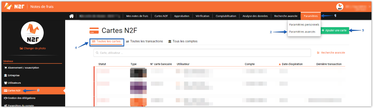 - Accédez à la rubrique Paramètres (1) / Paramètres avancés (2), puis cliquez sur Cartes N2F (3).